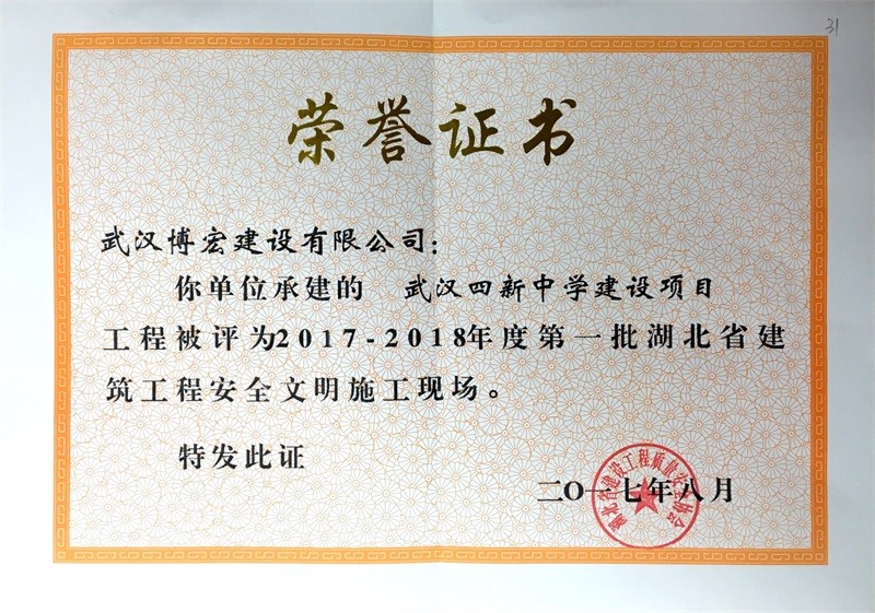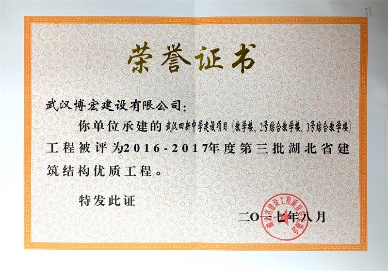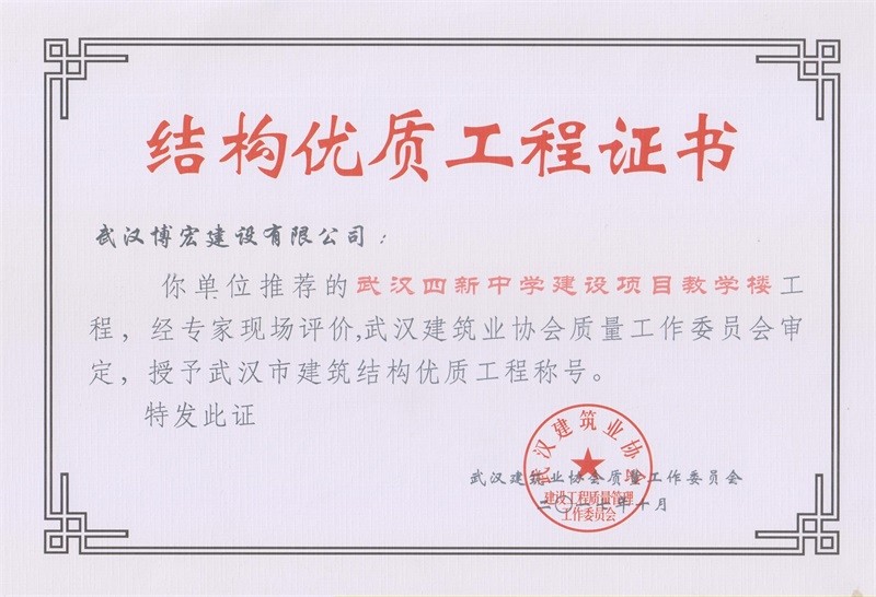 結(jié)構(gòu)優(yōu)質(zhì)工程證書(shū)(武漢四新中學(xué)綜合教學(xué)樓1-4號(hào)樓)