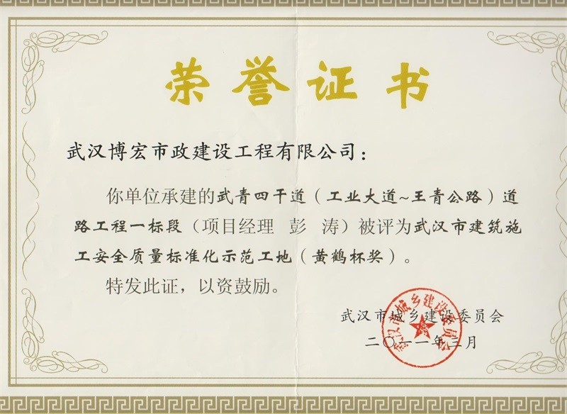 2011年度武漢市建筑施工安全質(zhì)量標準化示范工地黃鶴杯獎(武青四干道道路工程一標段)