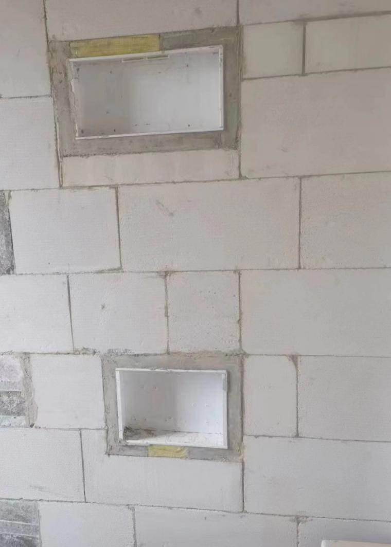 該技術(shù)在強(qiáng)弱電箱安裝之前先制作標(biāo)準(zhǔn)砌塊大小的模具,將電箱居中放置,安裝好進(jìn)出接管,預(yù)留進(jìn)線口位置,隨后倒入混凝土進(jìn)行預(yù)制,成型后按照砌體排版圖紙進(jìn)行砌筑即可。