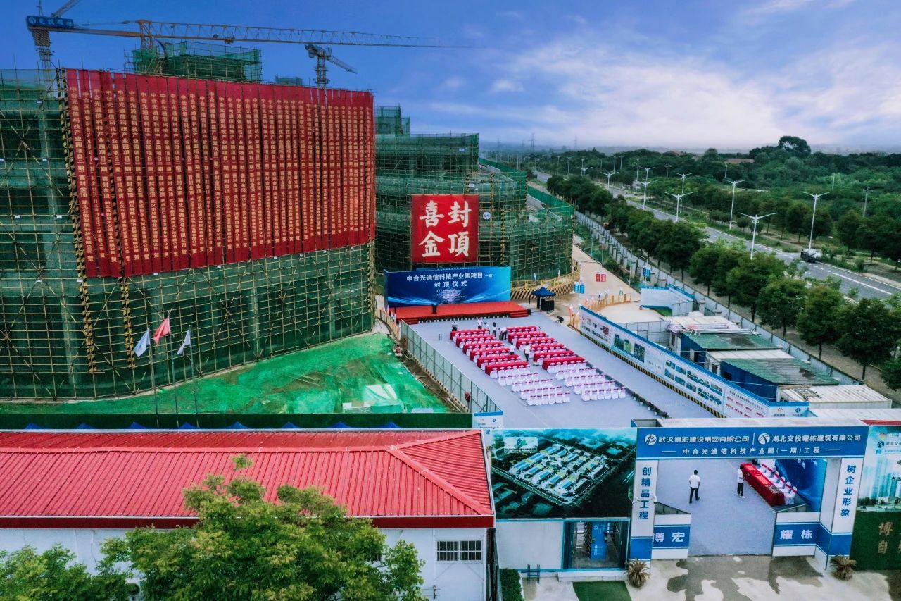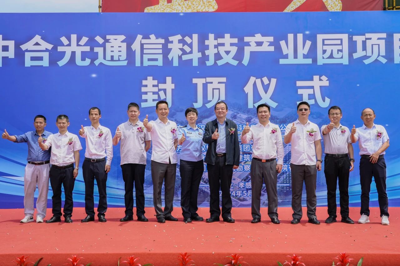 上午 11 時 18 分,孝感市人大常委會副主任、臨空區(qū)工委書記邱顯春宣布項目喜封金頂,現(xiàn)場禮炮齊鳴,中合光通信科技產(chǎn)業(yè)園項目(一期)封頂儀式圓滿禮成!