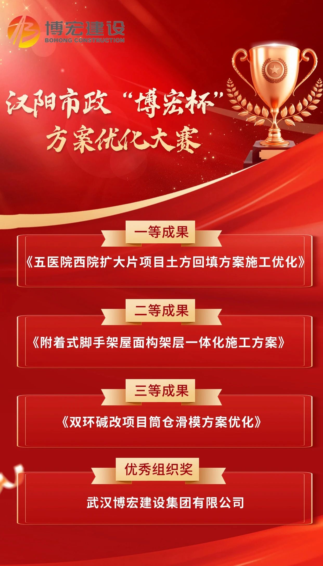 12月24日下午,漢陽市政“博宏杯”方案優(yōu)化大賽在漢陽市政建設(shè)大廈205會(huì)議室順利舉行,本次比賽以“技術(shù)賦能項(xiàng)目生產(chǎn)”為主題,經(jīng)過現(xiàn)場匯報(bào)評(píng)選,博宏建設(shè)集團(tuán)斬獲1項(xiàng)一等成果,1項(xiàng)二等成果,1項(xiàng)三等成果,與此同時(shí),公司獲評(píng)優(yōu)秀組織單位。